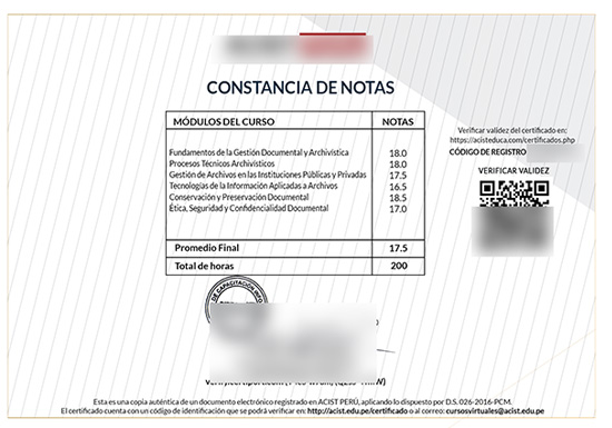 Los certificados de ACIST PERÚ cuentan con código QR de validación, lo que asegura su autenticidad y respaldo oficial según el D.S. 026-2016-PCM.