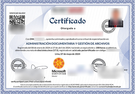 Al culminar de manera exitosa el curso, el estudiante obtendrá el Certificado en “Administración Documentaria y Gestión de Archivos”, respaldado con una carga académica de 200 horas (aprox. 10 créditos). Este documento se entrega en dos modalidades: digital y físico, brindando mayor accesibilidad y validez al reconocimiento obtenido.