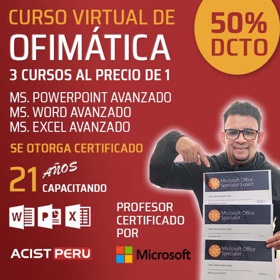 En Acist Perú, con más de 21 años de experiencia en educación, en convenio con Instituciones Reconocidas y con el respaldo de Profesionales Certificados por Microsoft, ponemos a tu alcance el Curso Virtual de Ofimática Nivel Avanzado.
