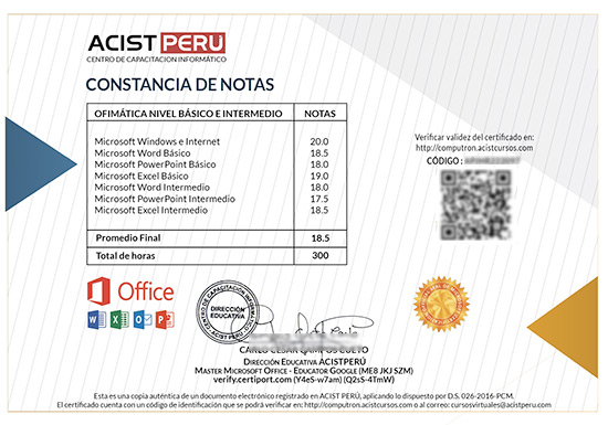 Asimismo, todos los certificados electrónicos emitidos por Acist Perú quedan registrados oficialmente en la institución, de acuerdo con lo establecido en el D.S. 026-2016-PCM. Ejemplo ingrese aquí: https://acistcursos.com/certificado
